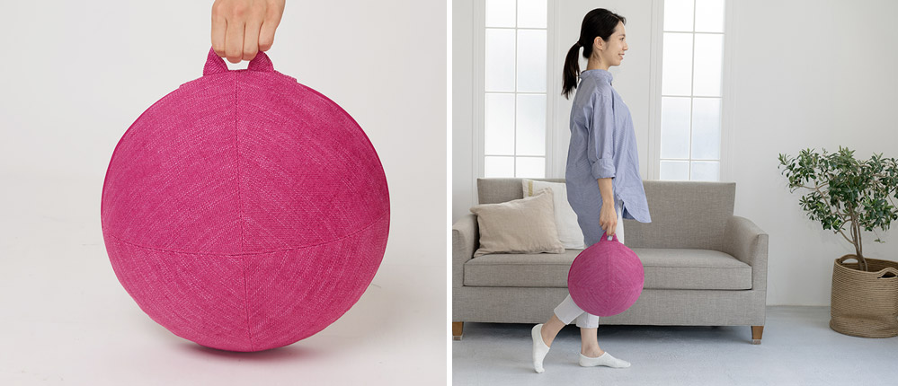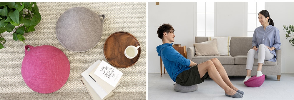 まるくてかわいい形状とデザイン性を重視したファブリックをセレクトしたことで、フィットネスアイテムというよりインテリアグッズのような仕上がりになりました。